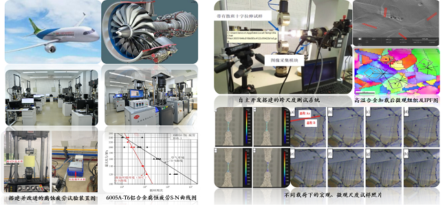 值得骄傲的是在航天航空领域,我们通过创新测试技术为国产大飞机翱翔蓝天保驾护航。围绕航空发动机叶片用高温合金,开发16项测试评价方法,形成3项国家行业标准,研制镍基高温合金全元素测定方法和5类标准物质,极大补充完善了现有高温合金测试评价体系。自主研制的腐蚀疲劳试验装置,为大飞机用铝合金结构材料的寿命评估提供了科学有效的研究手段;跨尺度评价系统,实现了从微米级到厘米级的材料组织和性能的实时动态测量,为高温合金变形、断裂、失效分析提供了全新的研究手段,填补了国内在跨尺度评价相关技术领域的空白。