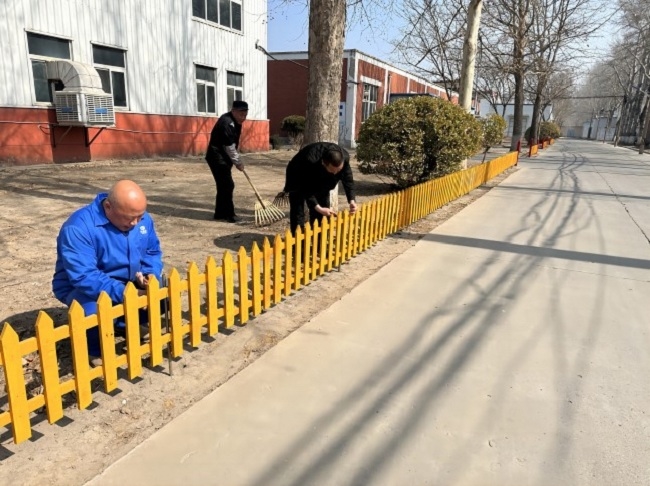二部园区职工利用业余时间收集废旧包装箱、铁管、木板等废旧物资,自己动手制作路边道路护栏,变废为宝美化园区环境。花期将至,绿化组职工在花房精心培育各种花卉,很多花种是职工们从自家带来的种子,职工们以园区为家,为二部园区增添一抹靓丽的春色。