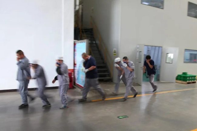 接下来进行应急演练,火灾现场第一发现人任永红利用喇叭进行示警,并大声呼喊:“起火了!起火了!”。随后在总指挥的统一指挥下,各应急小组各司其职,分工明确,全体员工有序快速地撤离了车间,集合至厂房东侧集结点,撤离过程安全、快速且有序。