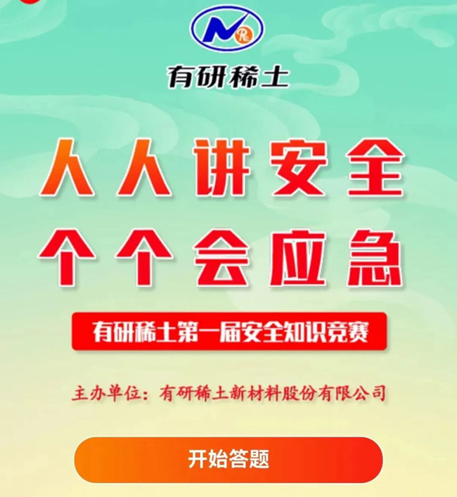 稀土安全知识竞赛试题库,并在公司全级次范围组织开展安全知识竞赛活动。该活动激发了大家学习安全生产知识的积极性,形成了以赛促学的良好氛围。截至目前,公司参与竞赛人数超870人。