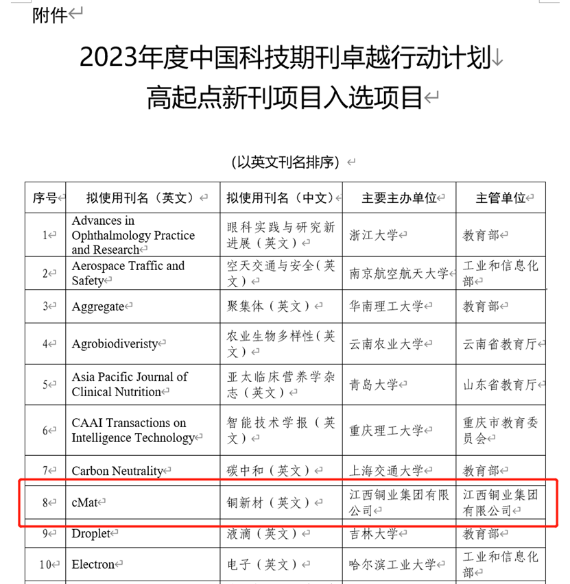 11月2日,中国科学技术协会发布《关于下达2023年度中国科技期刊卓越行动计划高起点新刊项目入选项目的通知》。有科出版与江铜集团组织申报的《cMat》(《铜新材(英文)》)成功入选,是有科出版继2021年《链(英文)》(《Chain》)、2022年《智能材料与系统(英文)》(《IntelliSys》)、《元资源(英文)》(《MetaResource》)后连续第三年入选高起点新刊项目,同时为江西省实现了高起点新刊的重大突破。