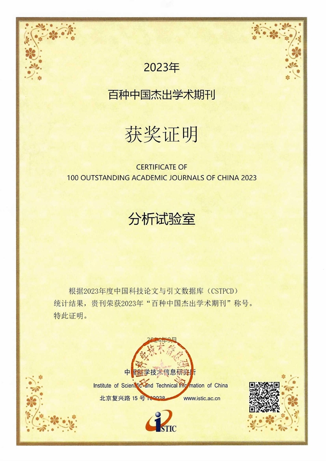 9月20日,中国科学技术信息研究所发布了2023年度中国科技论文统计结果,《分析试验室》再次荣获“百种中国杰出学术期刊”(累计获得6次),综合评价总分在冶金工程学科排名第二。