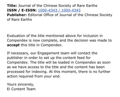 2021年4月3日,有科出版旗下《中国稀土学报》(Journal of the Chinese Society of Rare Earths)收到美国工程索引EI数据库正式收录通知,这是该刊继被美国化学文摘(CA)、荷兰Scopus、日本科技文献速报(JST)、美国EBSCO数据库和俄罗斯文摘(AJ)收录后又一重要进展,标志着《中国稀土学报》国际影响力得到进一步提升。《中国稀土学报》创刊于1983年,是报道稀土理论研究和应用技术的稀土类综合性学术刊物。美国工程索引(EI Compendex, 简称 EI)是全球著名工程技术类综合性检索系统。它与SCI、ISTP并列成为世界公认的三大权威数据库,最新目录共收录全球4500余种期刊,其中共收录中国大陆期刊229种,中文刊157种,英文刊71种。