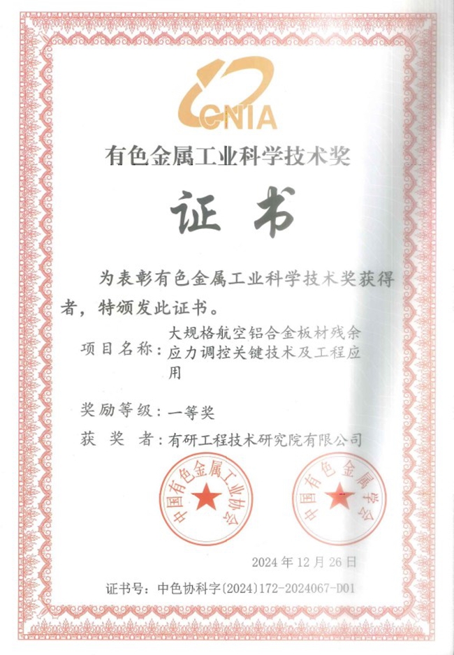 工研院结构事业部主持完成的《大规格航空铝合金板材残余应力调控关键技术及工程应用》项目荣获中国有色金属工业科学技术奖一等奖。