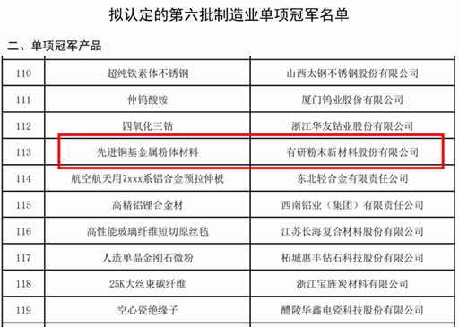 粉材榜上有名,“先进铜基金属粉体材料”入选制造业单项冠军产品名单。