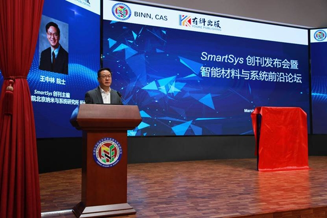 3月26日,由北京市科学技术委员会主管,中国科学院北京纳米能源与系统研究所(简称纳米能源所)主办,有科出版编辑出版的高起点新刊SmartSys(《智能系统(英文)》)创刊发布会暨智能材料与系统前沿论坛,在坐落于怀柔科学城的纳米能源所召开。中国科学技术协会科学技术创新部部长刘兴平,中国科学院外籍院士、纳米能源所所长、SmartSys主编王中林,国家自然科学基金委员会科学传播与成果转化中心主任彭杰,中国期刊协会副会长、有科出版总编辑钱九红,中国科学院文献情报中心计量与评价部研究员马峥,约翰威立国际出版集团中国区合作出版总监张大平,怀柔区科学技术委员会创新发展科马顺昌,北京大学材料与工程学院副院长周欢萍等人出席。