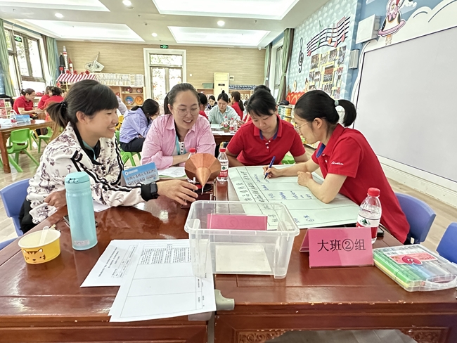 在教研现场,幼儿园展示了生动的室外自主游戏,孩子们积极主动、认真专注、大胆创想、勇于挑战,教师认真观察、支持幼儿自主选择。交流环节,分园执行园长杨益以 “杯垫” 记录法为抓手,串联场景回顾、要点对接、双向互动等环节,进行经验分享。