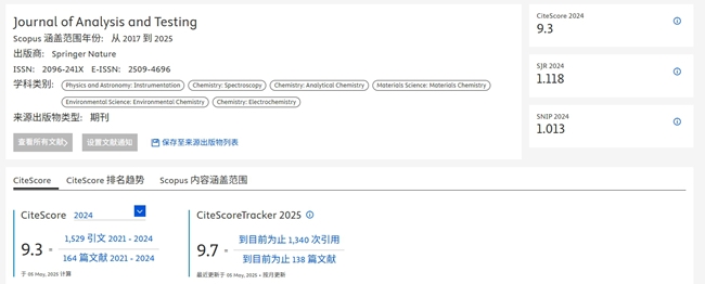《分析检测(英文)》2024年度CiteScore™为9.3,同比提升26%,在6个领域位于Q1区,其中在Analytical Chemistry领域排名26/160(前20%);在Instrumentation领域排名17/174(前10%);在Spectroscopy领域排名11/79(前15%);在Material Chemistry领域排名55/324(前20%);在Environmental Chemistry领域排名34/150(前25%);在Electrochemistry领域排名16/64(前25%)。
