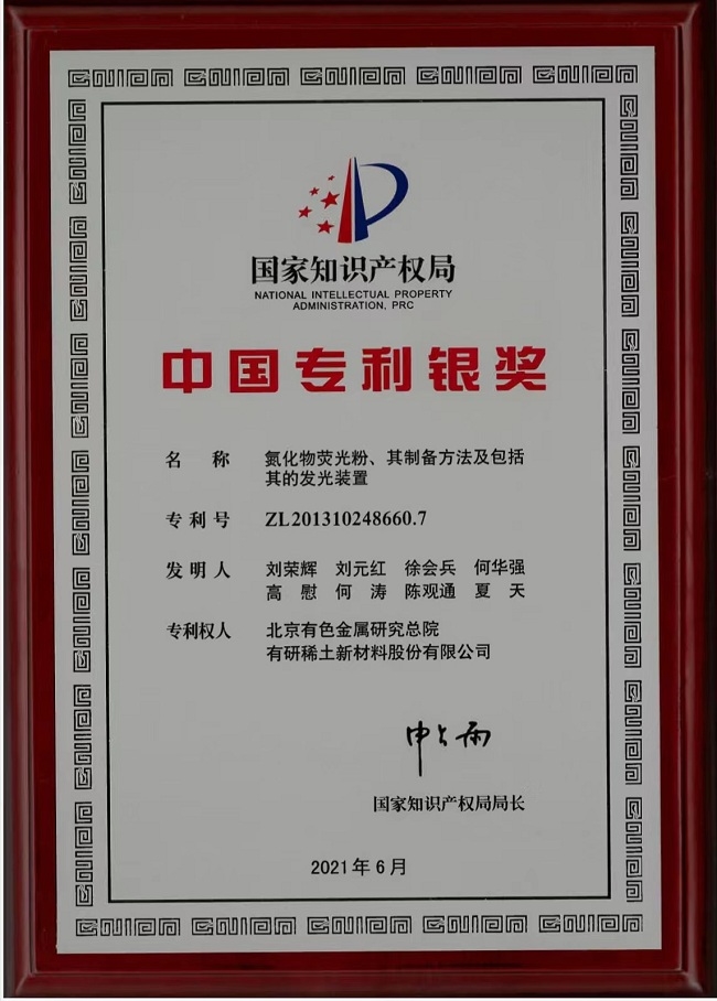 稀土申请的中国发明专利ZL201310248660.7 “氮化物荧光粉、其制备方法及包括其的发光装置”获中国专利银奖。六合彩特码