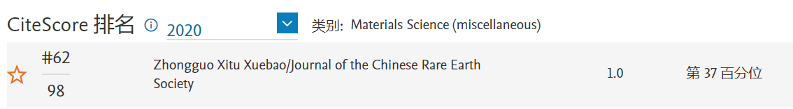《中国稀土学报》 CiteScore 2020:1.0,位于Materials Science (miscellaneous)学科Q3区(62/98)。