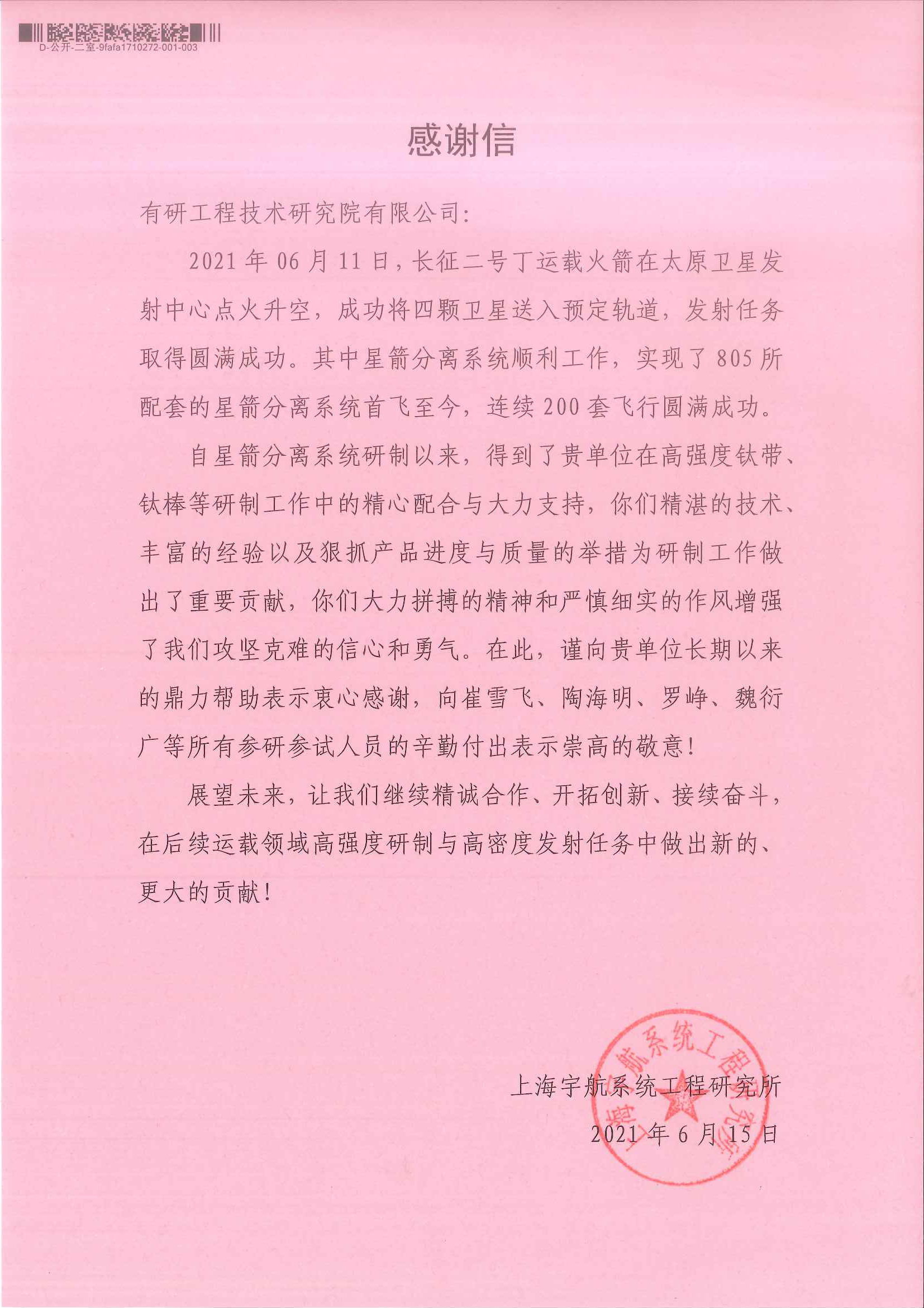 工程技术研究院有限公司有色金属结构材料事业部钛合金研究所作为星箭分离系统参研参试单位,为星箭分离系统提供了关键配套材料保障,研发的关键部件成功应用于资源、气象、通讯、导航及海洋卫星星箭分离系统,实现了300余颗卫星的安全解锁。在中国共产党成立100周年之际,实现了星箭分离系统连续200套飞行圆满成功,上海宇航系统工程研究所特为六合彩特码