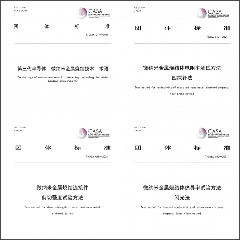 粉材参与制定了四项微纳米金属烧结团体标准,已面向产业发布,分别为《第三代半导体微纳米金属烧结技术 术语》(T/CASAS 017—2021)、《微纳米金属烧结件剪切强度试验方法》(T/CASAS 018—2021)、《微纳米金属烧结体电阻率试验方法 四探针法》(T/CASAS 019—2021)和《微纳米金属烧结体热导率试验方法 闪光法》(T/CASAS 020—2021)。