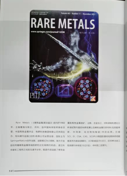 共同主办,有科期刊出版(北京)有限公司运营出版,国际上与SpringerNature合作出版,出版模式为订阅制。目前被SCI,EI,CSA,CAS,SCOPUS等国际著名检索系统或数据库列为收录源期刊,JCR影响因子4.003,在80种冶金工程类期刊中排名13(Q1区),中科院二区期刊。致力于出版和传播稀有金属领域的研究论文(和特约综述),建立科学家和工程师之间的沟通平台学。报道内容涵盖了稀有金属和有色金属选矿、冶炼、合金加工、材料研制和理化分析测试等方面的科研成果以及稀有金属在新材料(包括超导体、半导体、化合物和陶瓷)中的应用。