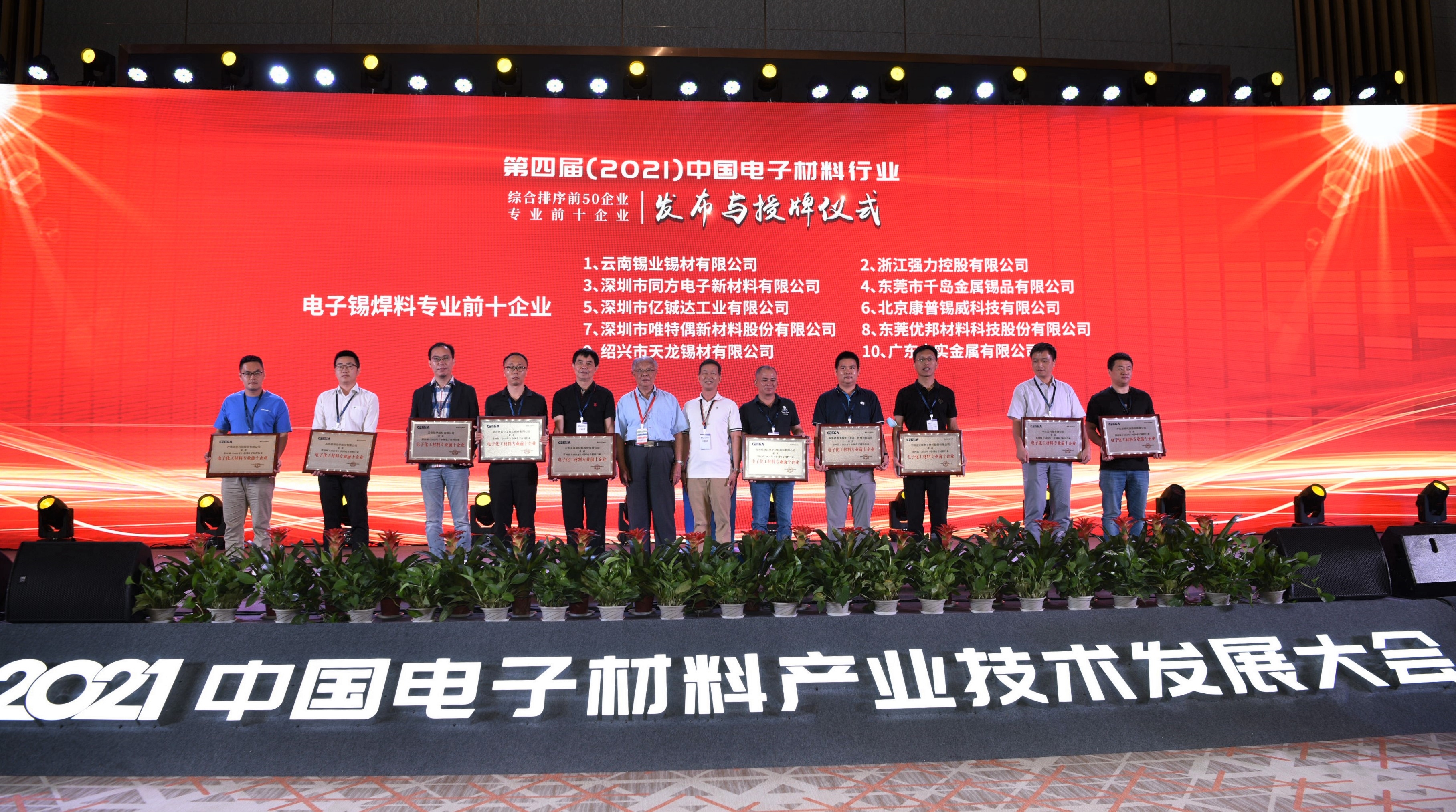 大会期间还进行了第四届(2021年)中国电子材料行业综合排序前50企业及半导体材料等八个专业前十企业榜单发布与授牌仪式。中国工程院院士、中国科学院院士以及中国电子材料行业协会领导等为获奖企业代表颁奖。康普锡威继续入围“电子锡焊料专业前十企业”。