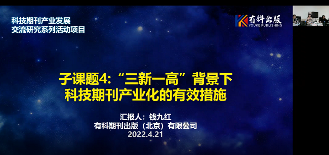 4月21日,有科出版顺利入选“‘学清刊壇’(第二期)—科技期刊产业发展交流研究系列活动”项目。由中国科协学会服务中心主办,同方知网(北京)技术有限公司承办的“‘学清刊壇’(第二期)—科技期刊产业发展交流研究系列活动”项目顾问委员会第一次会议在线上召开。董尔丹院士、黄小卫院士、刘文清院士、中国有色金属学会理事长贾明星及业内专家学者共计59人参会。有科出版承担了“学清刊壇(第一期)”子课题“中国科技期刊产业化发展战略研讨”并圆满完成了相关活动,“学清刊壇(第二期)”子课题“三新一高”背景下科技期刊产业化的有效措施的研究”再次由有科出版承担,董事长、总经理钱九红出席并汇报今年的工作计划和进度情况。