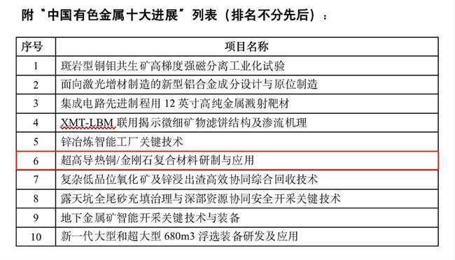 工研院结构事业部“超高导热铜/金刚石复合材料研制与应用”项目成功入选“中国有色金属十大进展”。