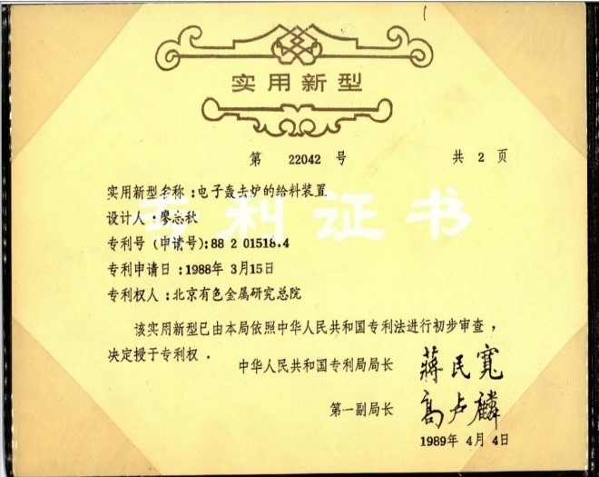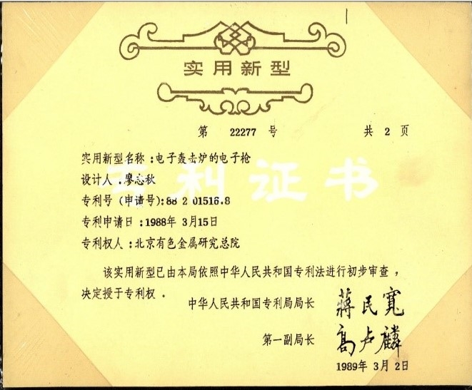 集团的先辈们创新性地改进了电子枪技术,研制出功率更高的电磁聚焦电子束炉,独立自主地设计出进料和拖锭机构,为当时三线工厂提高生产率作出了重要贡献。1978年,超高真空电子束区域熔炼炉获全国科学大会奖。1989年,电子轰击炉的电子枪和给料装置获得国家实用新型发明专利。