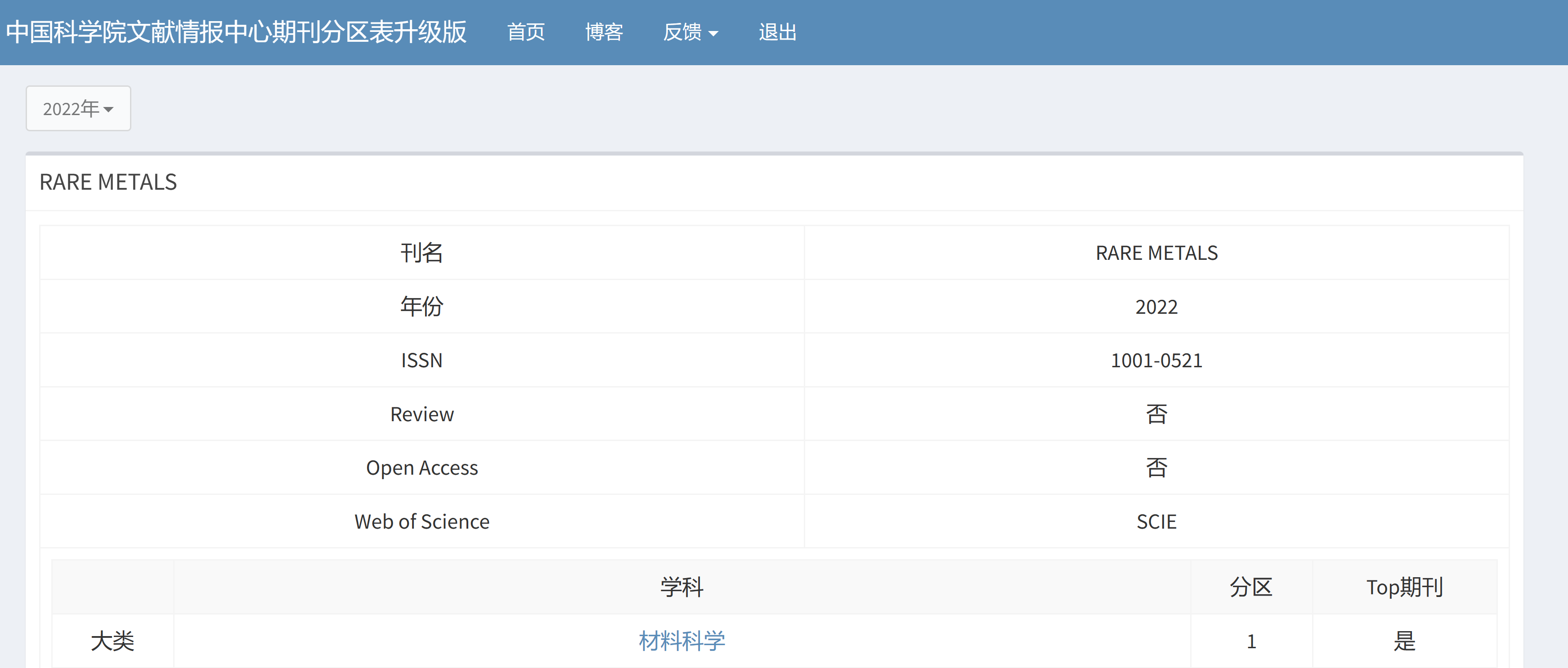 12月21日,《2022年中国科学院文献情报中心期刊分区表》正式发布。《稀有金属(英文版)》(Rare Metals)进入2022年中科院期刊分区表材料科学1区TOP期刊行列。材料科学类共有410本期刊,其中进入中科院期刊分区1区的有58本。