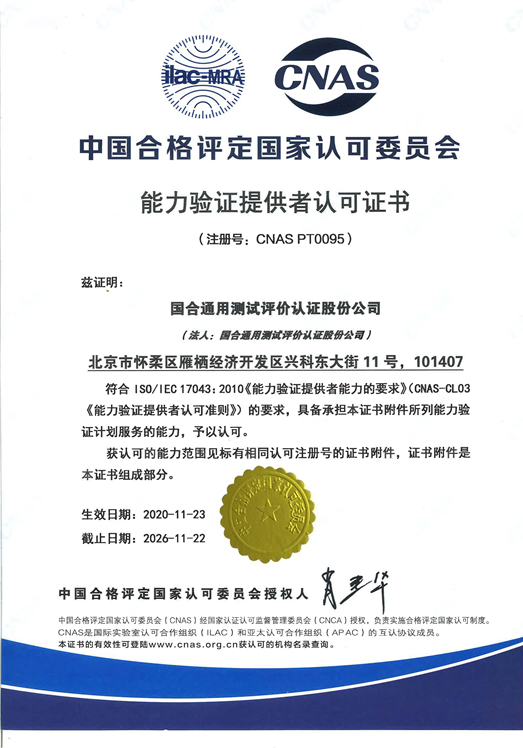 近日,国合通用测试评价认证股份公司能力验证中心顺利通过了中国合格评定国家认可委员会(CNAS)认可,证书编号为CNAS PT0095。这标志着国合通测正式成为“能力验证提供者”。