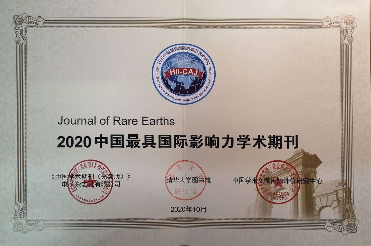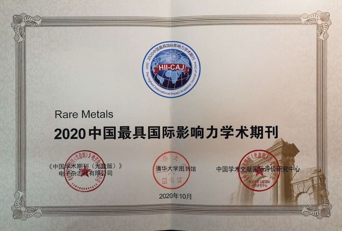 集团主办的《稀有金属(英文版)》(Rare Metals)、《稀土学报(英文版)》(Journal of Rare Earths)双双入选2020年“中国最具国际影响力学术期刊”榜单,连续9年荣获该称号。