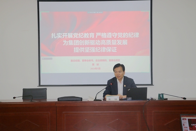 黄倬以《扎实开展党纪教育 严格遵守党的纪律 为集团创新驱动高质量发展提供坚强纪律保证》为题,从条例历次修订讲起,阐释条例修订与时俱进、问题导向的特点,突出进一步严明政治纪律和政治规矩、带动各项纪律全面从严,释放越来越严的强烈信号,结合国资央企相关典型案例,详细解读开展党纪学习教育的重要意义、新修订《条例》的主要内容以及《条例》对党员领导干部的新要求,教育引导广大党员明纪、学纪、知纪、守纪。