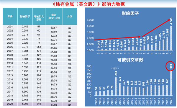 博观约取,厚积薄发。2001年,期刊被美国《科学引文索引》SCIE收录,其后期刊影响因子和影响力稳步提高,特别是近十年,影响因子呈飞跃式攀升:从0.493稳步提升至4.003,增长8倍,发文量从119篇增加到349篇;2019年首次进入国际冶金工程类Q1区,成为中国81本Q1区期刊之一;2020年度影响因子在中国大陆265本SCI收录期刊中排第96位、冶金工程领域中国大陆11种期刊中排第3位;2020年度发文量在中国大陆265本SCI收录期刊中排第16位、冶金工程领域中国大陆11种期刊中排第3位。期刊影响因子和发文量实现双增长,是一流科技期刊一流学术平台初期探索与实践的成功案例。此外,《稀有金属(英文版)》获得多项行业奖项,入选中国科技期刊卓越行动计划,获评国家新闻出版局首届全国百强报刊、中国科协优秀国际科技期刊奖、中国最具国际影响力学术期刊(连续9年)、“有色金属领域科技期刊高质量分级目录”T1级别期刊、中国有色金属出版物奖(连续4次)、中国科协主管科技期刊审读优级期刊等。