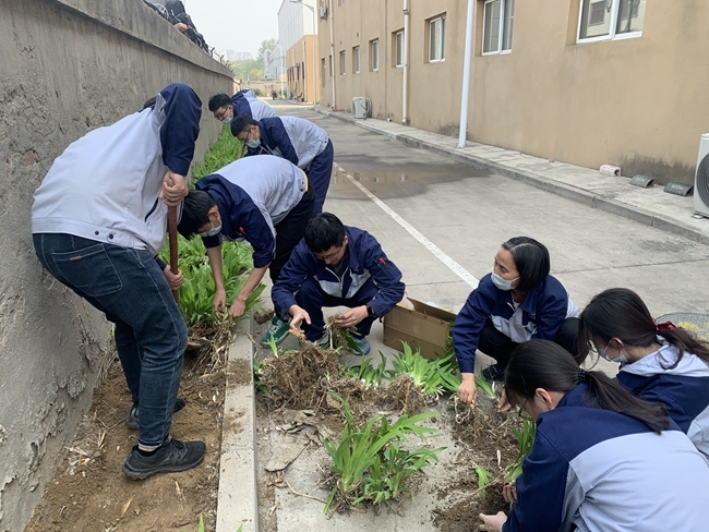 国晶辉团支部组织团员青年在园区开展绿化,一起移栽鸢尾花。