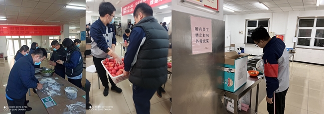 国晶辉团支部不定期给职工分发新鲜水果和蔬菜,并联合条保部开展“包饺子,吃饺子”活动,同时成立青年“后勤小分队”,提供全方位服务保障,不断丰富驻厂职工生活、饮食多样性,保障职工身体健康,使驻厂职工感受到家的温暖。