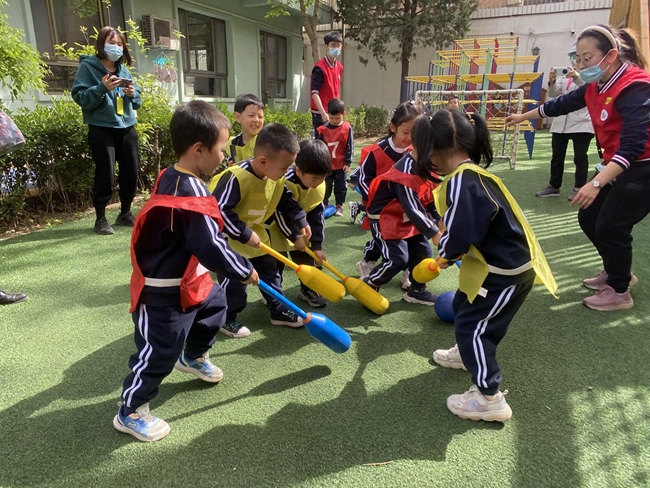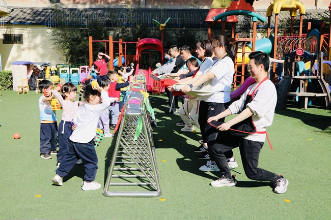 幼儿园设计了《母鸡下蛋》《给小兔子送萝卜》《猫和老鼠》《围裙接球》等趣味性、互动性强的亲子运动游戏;在体验运动带来快乐的同时,既增进了幼儿与同伴彼此之间的友谊,更增强了幼儿与家长之间的情感交流。小运动员们和爸爸妈妈们一起互动游戏,大家在欢声笑语中享受着幸福的亲子时光。