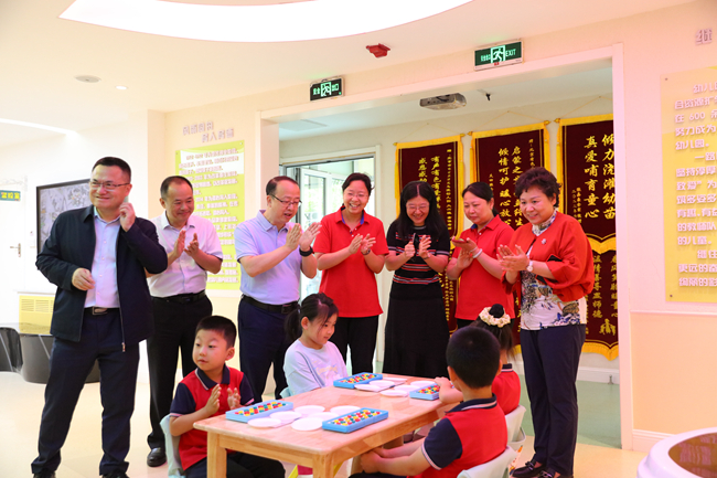毛昌辉观看了幼儿园丰富多彩的迎六一活动并听取了活动介绍,肯定了教职员工付出的努力,并参与了水拓画、笔墨童心等游戏项目。