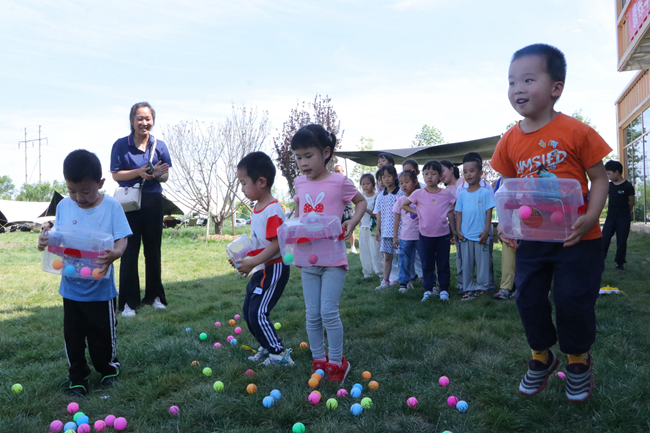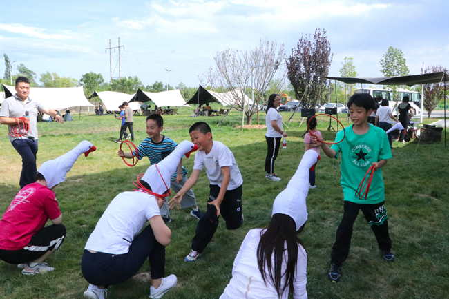 下午,大家来到户外进行“六一”露营活动。家长们坐在天幕下享受阳光和微风,小朋友们则自主背上工会准备的水枪玩具,在柔软的草地上发动“水枪大战”。“战斗”之余,小朋友们还参与了套圈、绑球跳等小游戏,家长们则戴上大鹅公仔帽子和孩子们进行充满笑声的亲子互动。