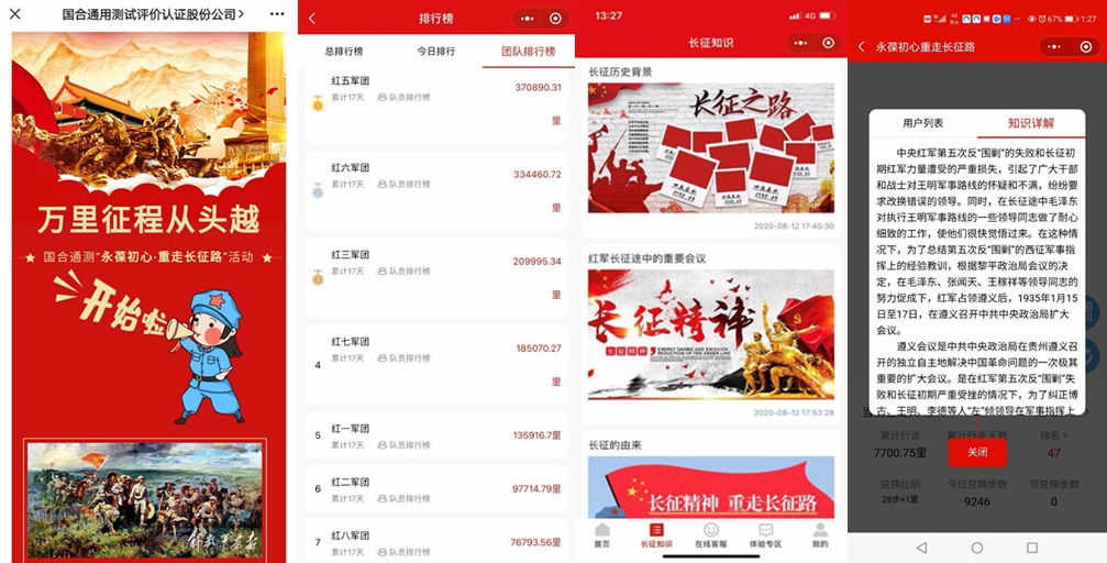 自3月15日起,国合通测7个党支部分别命名为红军长征中的7个军团,以每日线下行走步数兑换线上里程,力争七一前人均走完25000里(行军标准为每日人均至少7100步)。同时通过“重走长征路”程序,专题学习党史知识。每到达红军长征标志性地点,可点击弹框学习相关知识。
