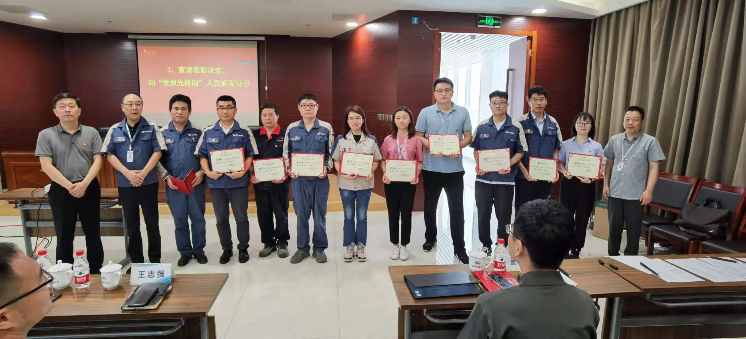 稀土党总支决定授予十六名党员同志“党员先锋岗”称号。党总支青年委员刘荣辉宣读了表彰名单,刘慧舟书记、李红卫教授和李宗安副总经理一起向受表彰同志颁发“党员先锋岗”荣誉证书。