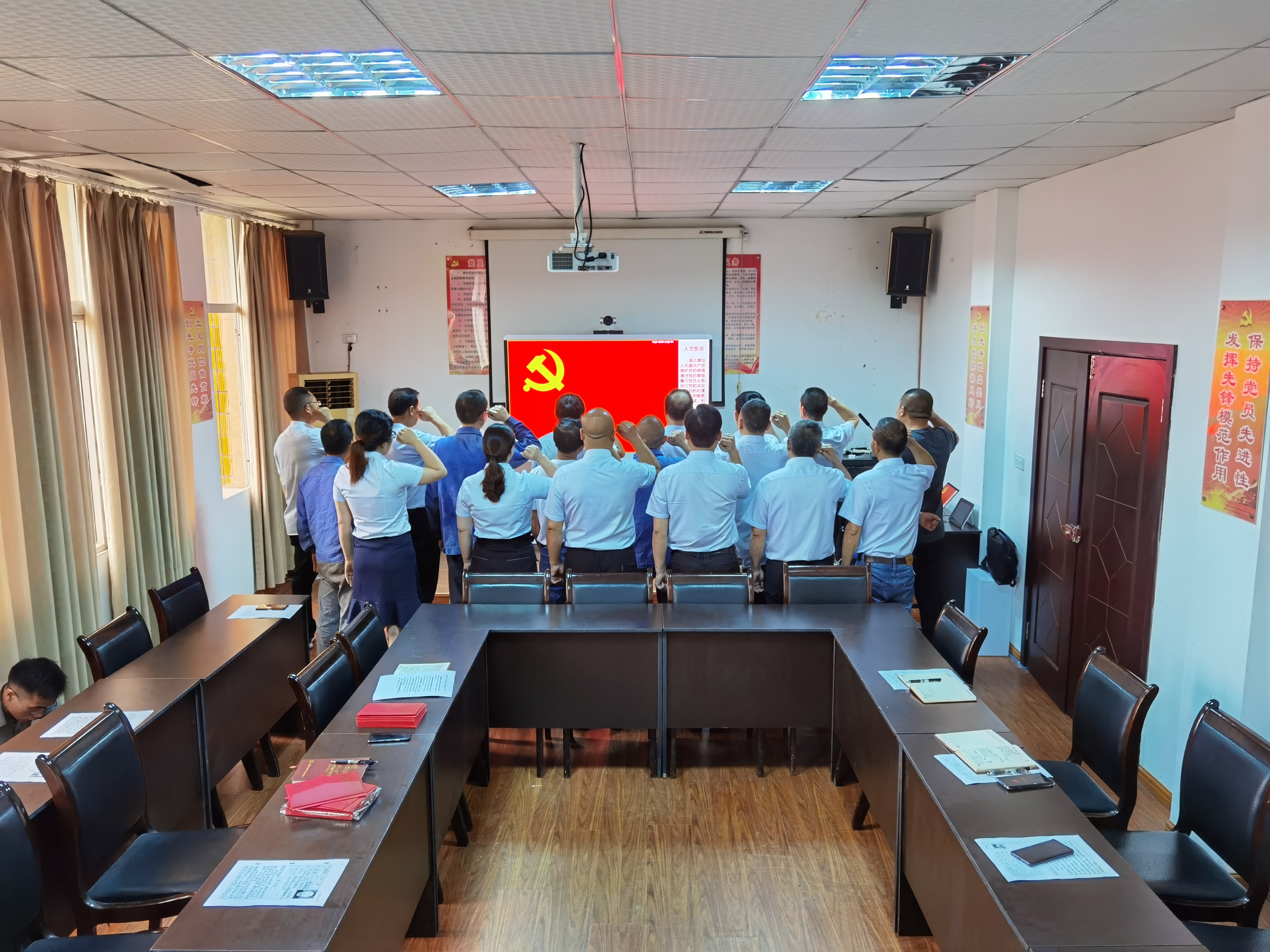 重温一次入党誓词。座谈会开始,全体党员在鲜红的党旗前,握紧右拳,重温入党誓词,拉开了此次党员“政治生日”座谈会的序幕。