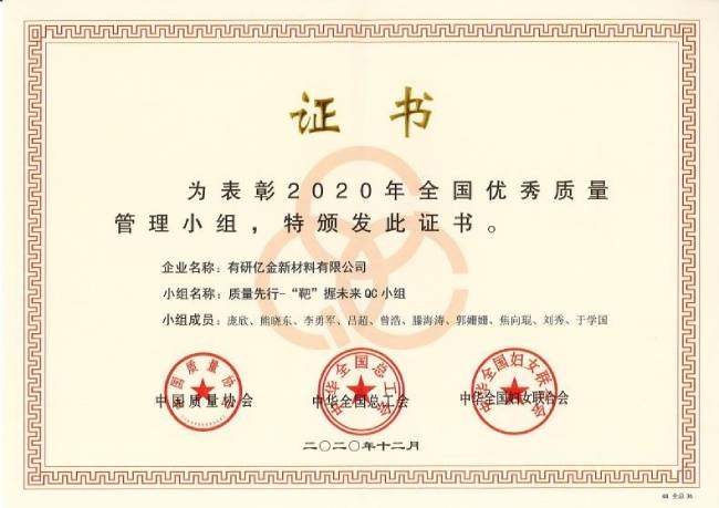 亿金荣获“2020年全国优秀质量管理小组”,六合彩特码