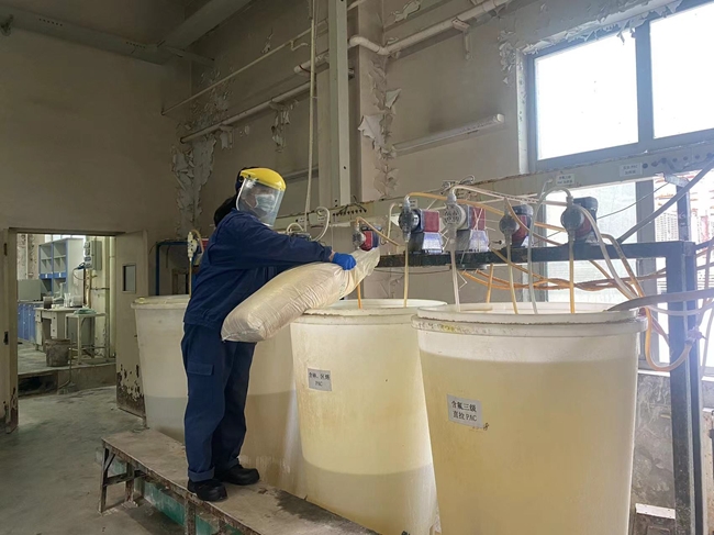 技术人员:污水的变化多种多样,即使是同一个产线排放的污水,每天的情况都是不同的,这需要技术人员对收集到的污水进行初期分析,调试出配比合适的药剂,再对污水进行批量处理。通过多年的实验积累,她能够做到看水的颜色和状态分析出所需要添加药剂的品种和药量,大大提高了水处理效率。