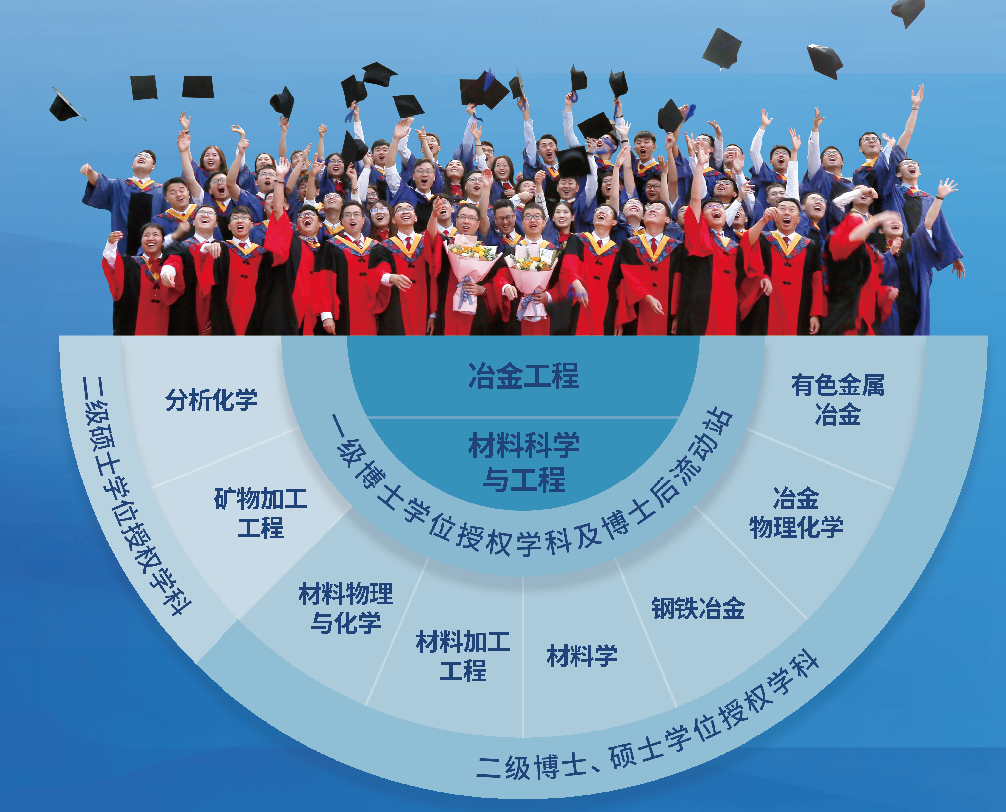 现有两个一级博士、硕士学位授权学科:材料科学与工程、冶金工程,另有分析化学、矿物加工工程两个硕士学位授权点,具有材料科学与工程、冶金工程两个博士后科研流动站,并与多家企业联合建立博士后工作站。