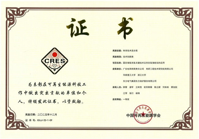 工研院新能源事业部主持完成的“固态储氢供氢关键技术及其在氢储能站的应用”项目荣获中国可再生能源学会科学技术奖技术创新类一等奖。