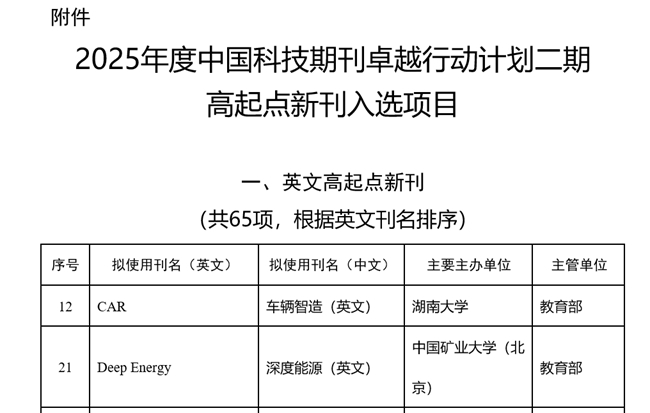 12月5日,中国科学技术协会正式发布《关于下达2025年度中国科技期刊卓越行动计划二期高起点新刊入选项目的通知》,有科出版联合优势领域高校,在前沿交叉领域精准布局,《车辆智造(英文)》(CAR)和《深度能源(英文)》(Deep Energy)两本新刊双双成功入选。