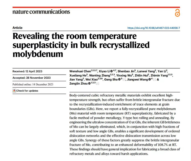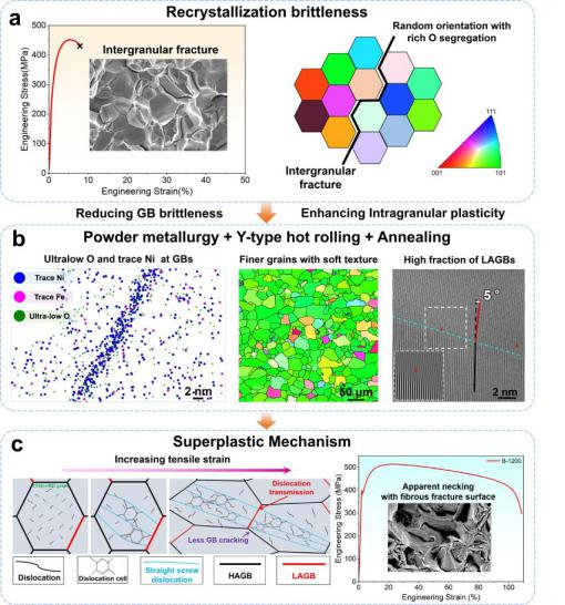 智能传感功能材料国家重点实验室联合有色金属制备加工国家重点实验室,以及浙江大学、南京理工大学等优势高校共同完成。创新团队通过粉末冶金、Y型热轧和热处理的工艺组合,制备出具有室温超塑性的完全再结晶纯钼材料。通过在晶界处设计超低氧浓度消除钼的本征晶界脆性,且与高比例的<110>//RD织构和小角度晶界相结合,实现了晶内位错网络的有序演变以及小角度晶界处(≤15°)的位错穿越。这些因素的协同作用极大抑制了钼的晶间脆性断裂倾向,获得最高108.7%的室温总延伸率。该发现揭示了难熔金属室温超塑性变形的新机制,为制造苛刻应用场景所需难熔金属及合金提供了理论支撑与可行路线。