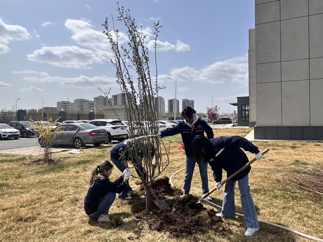在植树现场,公司领导与干部职工分工协作,默契配合,干劲十足。挥锹铲土、填入树苗、放苗填土、提桶浇水,植树现场一派热火朝天的景象。经过一番辛勤劳动,树苗全部栽种完成。新栽的树苗昂扬而立,迸发盎然生机,为园区增添了一片生机勃勃的绿色。