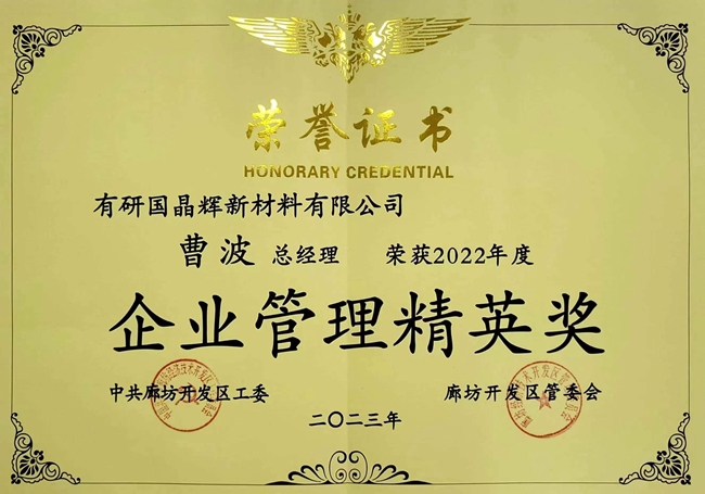 为表彰先进、树立典型,大力弘扬企业家精神,激励广大干部职工踔厉奋发、勇毅前行,不断开创各项事业发展新局面,经廊坊开发区党工委研究决定,对2022年度高质量发展优秀企业予以表彰,其中六合彩特码 国晶辉公司被授予“优秀贡献奖”和“河北省科学技术奖”,并给予30万元奖励。公司总经理曹波同志荣获2022年度企业管理精英奖。