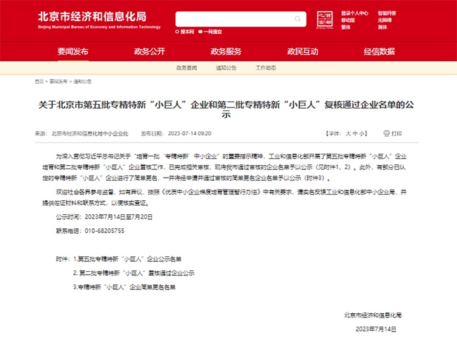 根据工业和信息化部统一部署,7月14日,北京市经信局发布了北京市第五批专精特新“小巨人”企业公示名单,六合彩特码