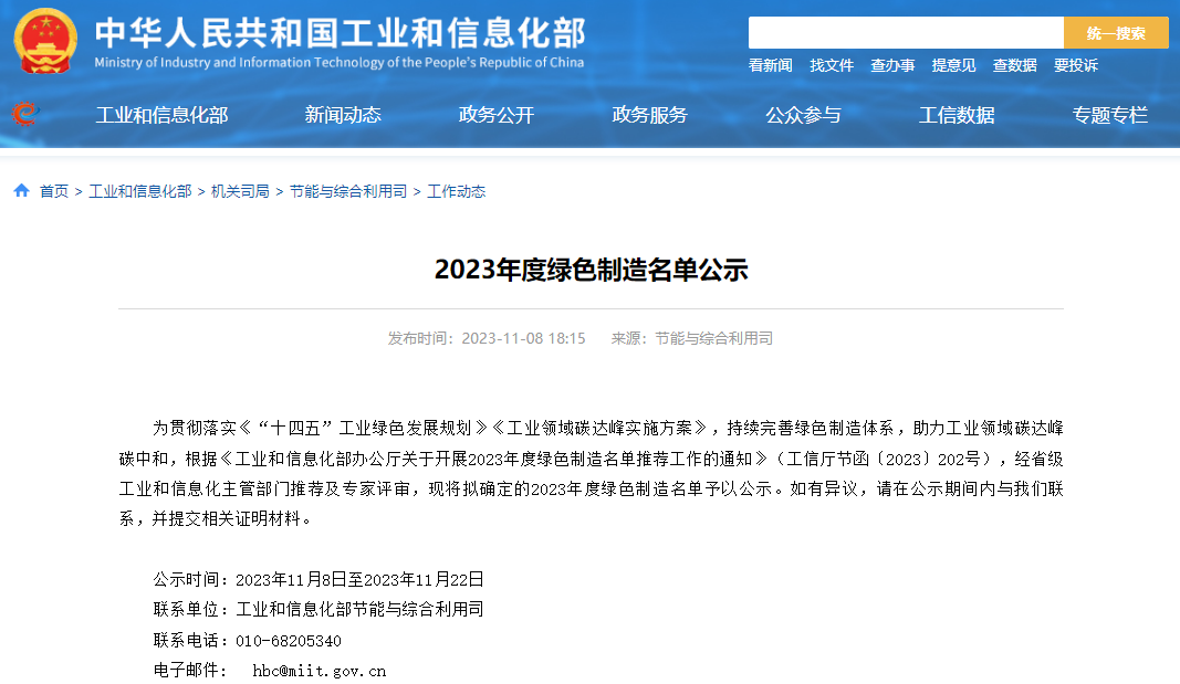 11月8日,工业和信息化部就拟入选的2023年度绿色制造名单进行公示,由国合通测作为第三方评价机构推荐的西安超晶科技股份有限公司荣登榜单。