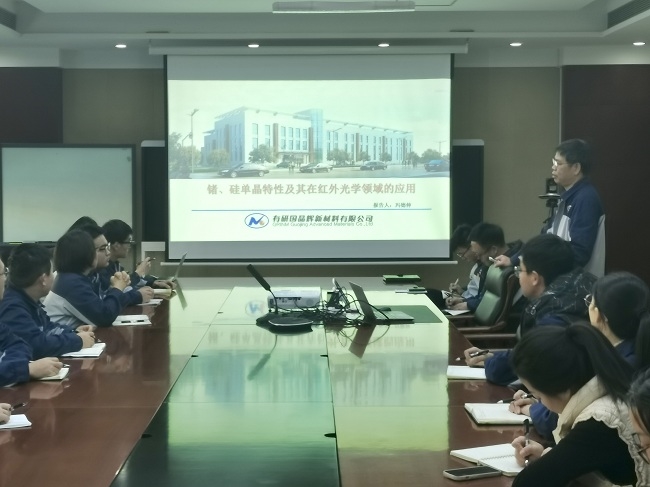 国晶辉技术总监、正高级工程师冯德伸以《锗、硅单晶特性及其在红外光学领域的应用》为题进行了专题讲座,公司部分中高层管理人员和科研技术骨干员工参加了讲座。