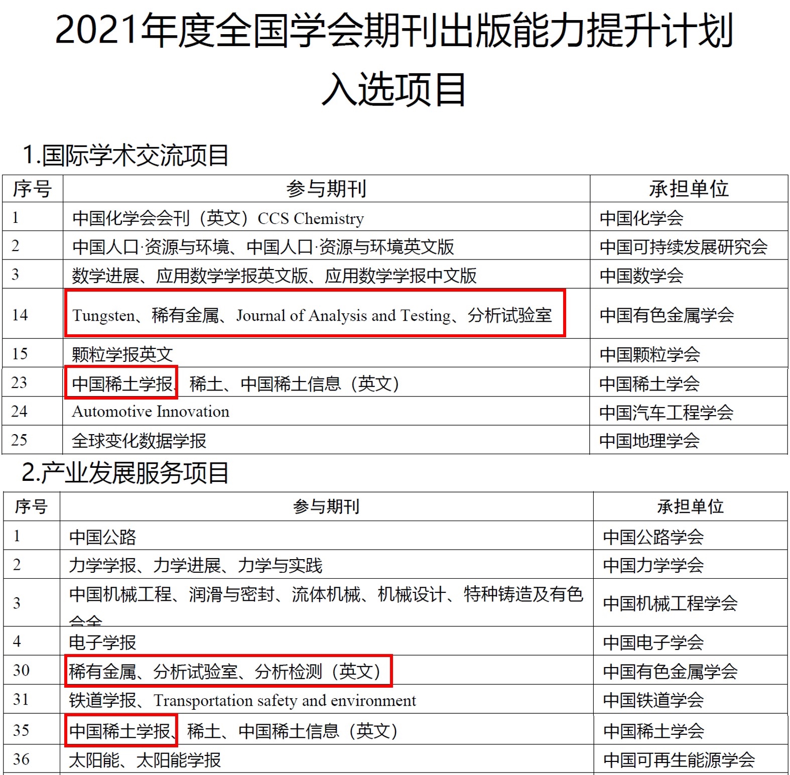 入选项目由中国有色金属学会和中国稀土学会牵头申报,由有科出版负责具体实施。项目旨在强化中国科协全国学会办刊能力建设,提升学会主办科技期刊的学术组织力、人才凝聚力、创新引领力、国际影响力,全力推进一批优秀期刊跻身世界一流阵营。