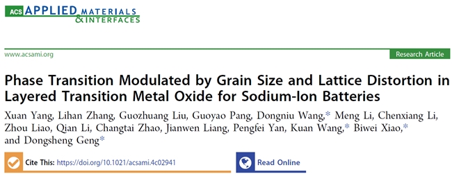 此外,团队针对O3型材料的相变与循环稳定性的构效关系,在《ACS Applied Materials & Interfaces》上发表了题为“Phase Transition Modulated by Grain Size and Lattice Distortion in Layered Transition Metal Oxide for Sodium-Ion Batteries”(影响因子9.5)的成果。该研究指出,O3型层状正极材料脱钠过程中产生的滑移是引起剧烈体积变化以及材料颗粒裂纹的主要原因,通过控制更小的晶粒尺寸及扭曲程度更大的过渡金属-氧八面体可以有效降低滑移的剪切应力,从而提升材料的循环寿命。
