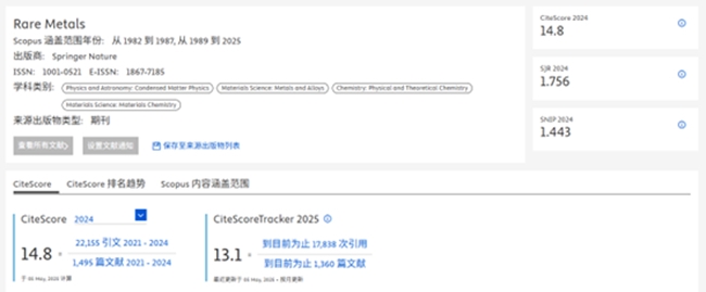 《稀有金属(英文版)》2024年度CiteScore™为14.8,同比提升22%,继续保持高位增长,在4个领域位于Q1区,排名全部位于所属领域前10%,其中在Metals and Alloys领域排名10/175(前10%);在Physical and Theoretical Chemistry领域排名15/187(前10%);在Condensed Matter Physics领域排名21/443(前5%);在Materials Chemistry领域排名26/324(前10%)。