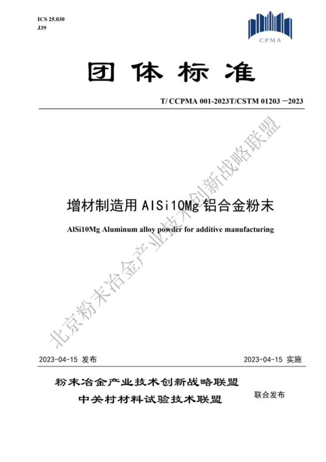 增材技术有限公司牵头、联合增材制造产业链上下游其他五家单位共同制定的团体标准《增材制造用AlSi10Mg铝合金粉末》(标准号:T/ CCPMA 001-2023T/CSTM 01203—2023)荣获2024年度中关村材料试验技术联盟标准创新贡献奖一等奖。