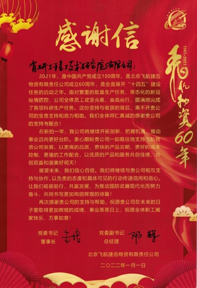 工研院收到北京飞航捷讯物资有限责任公司发来的感谢信,感谢六合彩特码